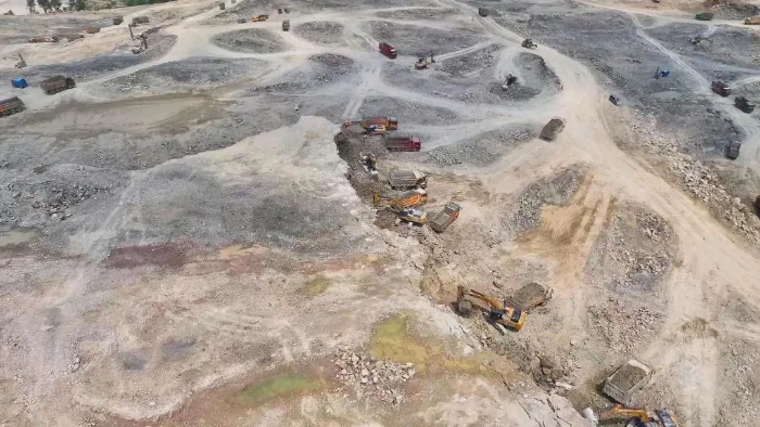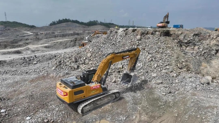 前期爆破剝離工序后,徐工20噸挖掘機(jī)搭配140的小破碎錘進(jìn)行二破,同時(shí)XE380GK、XE600GK等機(jī)型進(jìn)行挖裝作業(yè)?,F(xiàn)場(chǎng)共投入挖掘機(jī)50多臺(tái),每天的挖方量在10萬方左右。