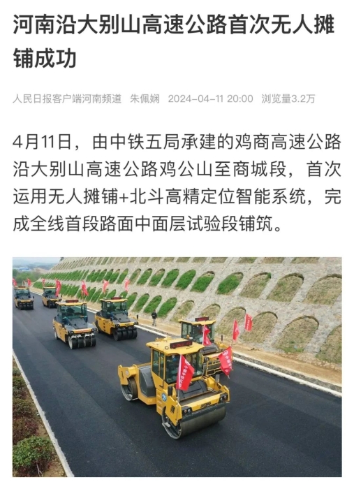 此次試驗段是沿大別山高速公路雞公山至商城段JSSG-2標(biāo),首次運用無人攤鋪+北斗高精定位智能系統(tǒng),完成全線首段路面中面層試驗段鋪筑。