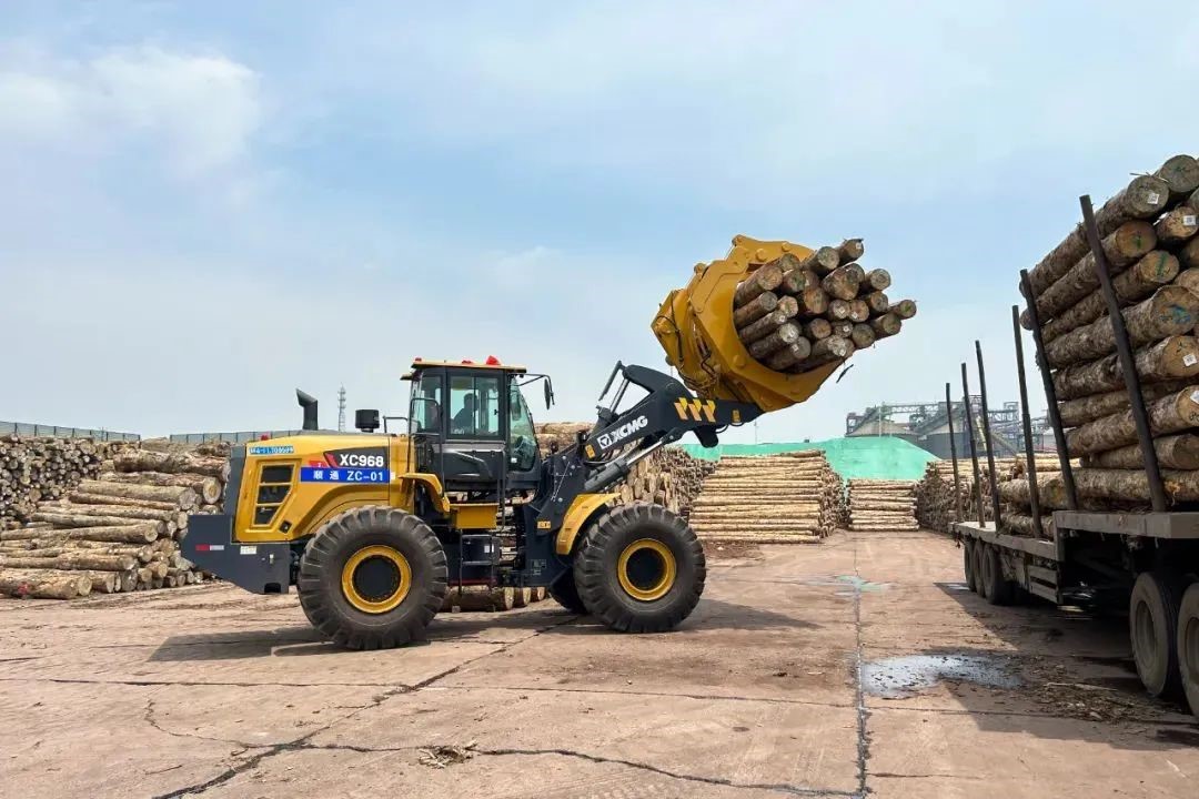 隨著滿載原木的貨輪緩緩靠岸,日照港瞬間切換為一派繁忙景象,20臺(tái)徐工XC968I夾鉗機(jī)迅速啟動(dòng)、排列有序登上甲板,將原木從入港船舶上夾起、轉(zhuǎn)運(yùn)至等待裝運(yùn)的卡車,動(dòng)作一氣呵成。