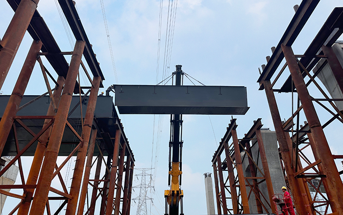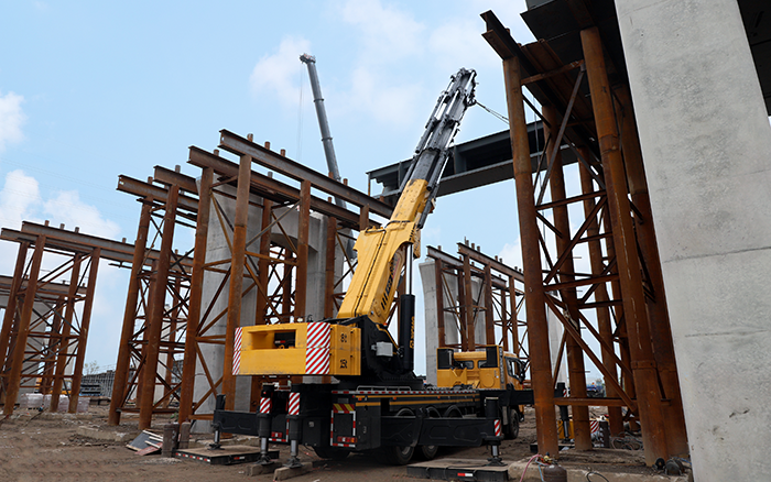 徐工SQZ8000的臂架采用五節(jié)伸縮臂,四節(jié)雙推,具有更強的起升能力及帶載伸縮能力,平均6h可完成5段結構安裝。負載敏感比例控制系統(tǒng)提升產品的微動性和聯(lián)動性,方便設備的精準定位安裝,大大提升安裝施工效率,確保橋面結構鋪設搭建任務的順暢收官。