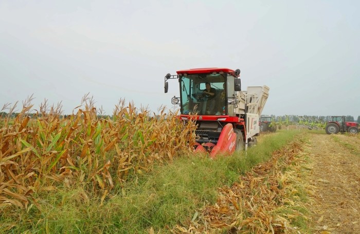 萬里晴空之下,XCA420玉米收獲機在田間來回穿梭,玉米植株連稈帶穗被收入機械中,頃刻間,摘棒、剝皮、秸稈粉碎一氣呵成。金黃的玉米果穗從儲糧倉傾瀉而下,由農用運輸車轉運至糧倉。