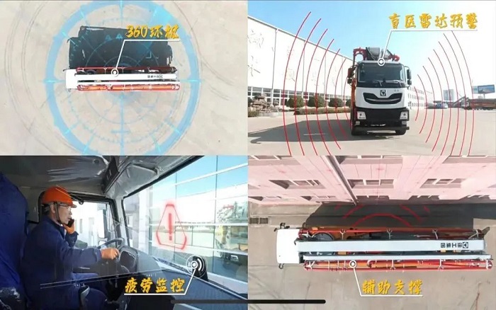 車身同時配有盲區(qū)雷達預(yù)警、360環(huán)視等輔助駕駛系統(tǒng),提升泵車駕駛安全系數(shù),行車更安心。
