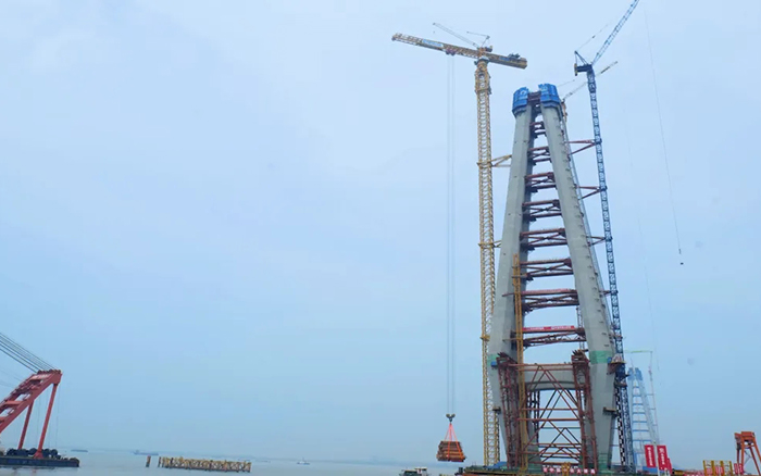 常泰長(zhǎng)江大橋主航道橋主跨1176m,主塔總高352m。采用XGT15000-600S塔機(jī)進(jìn)行上部鋼塔柱施工吊裝僅需將鋼塔柱劃分為30個(gè)吊裝單元,最大單元重量超500t,較傳統(tǒng)施工方式效率提升60%以上。