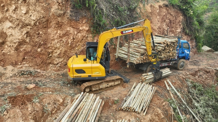 在鄭俊負責(zé)的林場,每節(jié)木材長度2.6米,徐工XE85GF一次可以夾10節(jié)以上的木材,重量超過1噸,而之前的輪挖夾裝0.6噸木材已是極限。