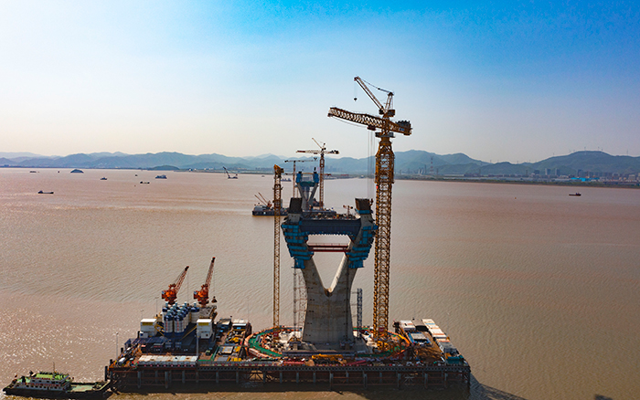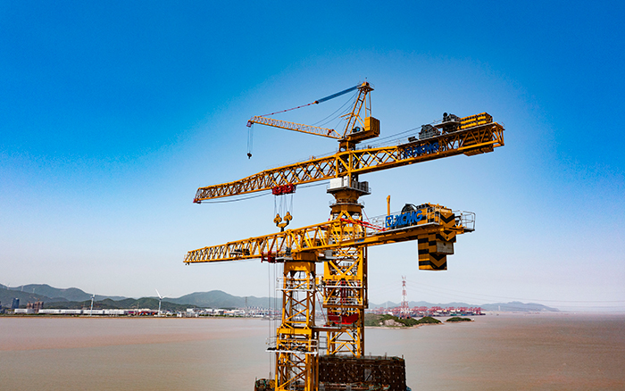 初夏時(shí)節(jié),東海之畔,徐工XGT7300-260S、XGT8300-320S揮舞鐵臂,如“定海神針”矗立深藍(lán),助力舟山六橫大橋二期工程青龍門(mén)大橋主塔施工,“海上巨龍”穩(wěn)扎穩(wěn)打向上攀升。