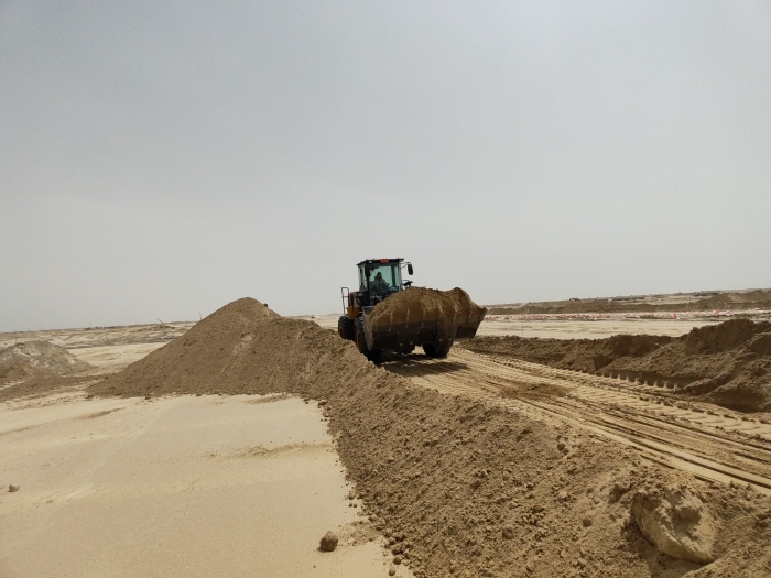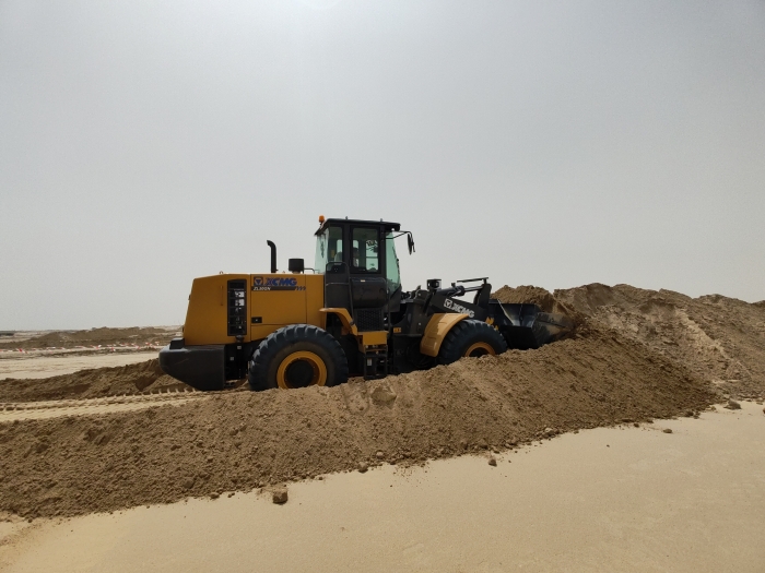 當(dāng)?shù)亟鸸忾W耀的沙漠地帶是極具標(biāo)志性的景觀,數(shù)臺徐工ZL50GN裝載機正在其中緊張作業(yè)。擔(dān)負(fù)起土方搬運、路基平整、材料裝卸等關(guān)鍵任務(wù),在高溫、多塵的惡劣環(huán)境下依然表現(xiàn)出眾,成為不可或缺的重要力量。