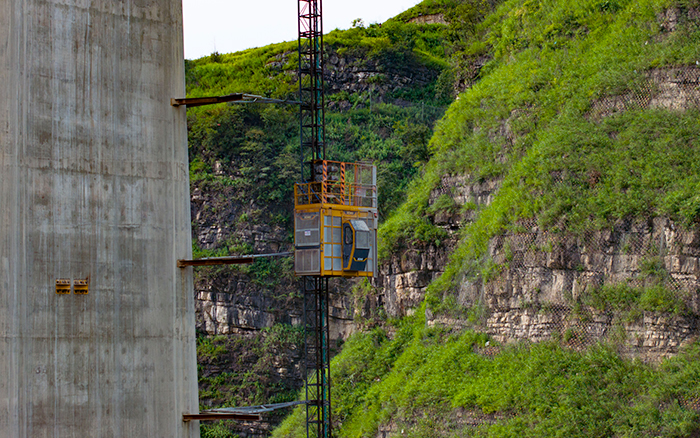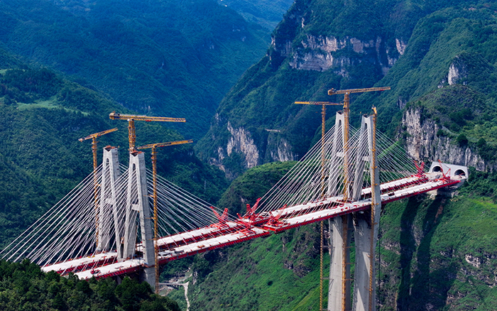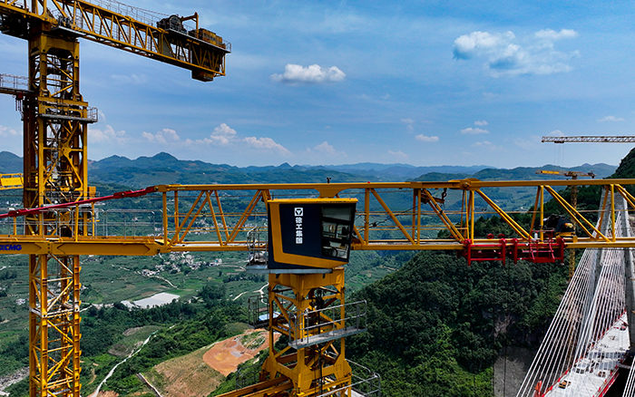 在黔中腹地懸崖峭壁間的烏長高速公路金旗特大橋項(xiàng)目上,徐工群塔與施工升降機(jī)協(xié)同作業(yè),助力世界最高深山峽谷連體斜拉橋建設(shè)。