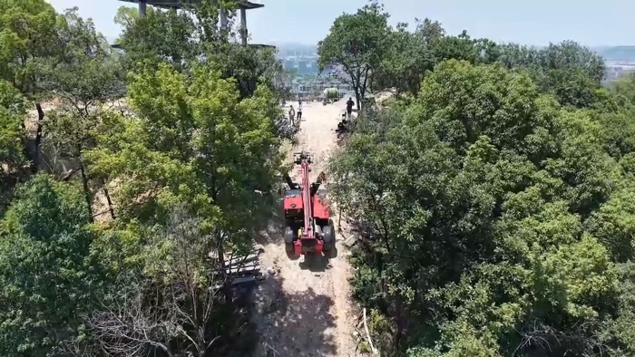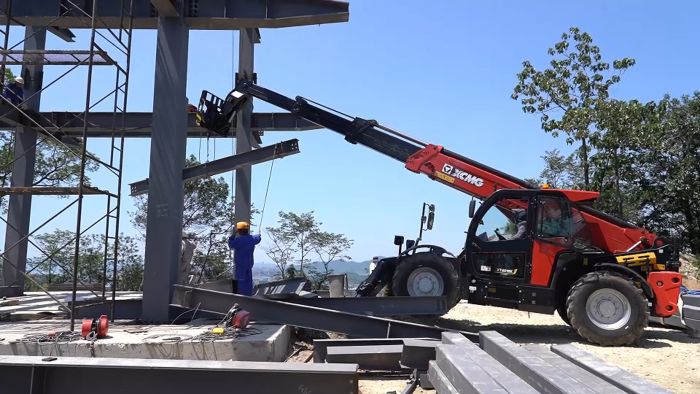 穿過羅峰寺旁的盤山公路,一抹紅色在山野間格外顯眼,徐工伸縮臂叉裝車XT4018K正將重達2.2噸的結構物料運送至14米的高度,全力建設全鋼結構寺廟。