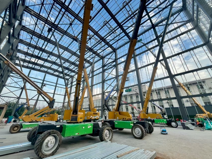 多臺設(shè)備組成的"綠色戰(zhàn)隊"展現(xiàn)出強大的協(xié)同作業(yè)能力,其靈活的轉(zhuǎn)向模式和強大的通過性在密集的鋼構(gòu)件中穿梭自如,大幅提升了焊接安裝的效率,為這項重點工程的順利推進提供了強有力的高空保障。