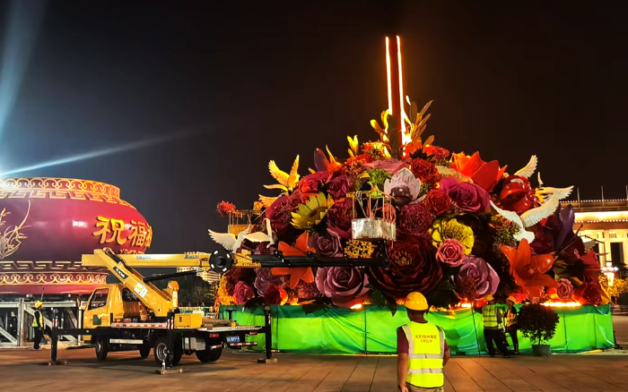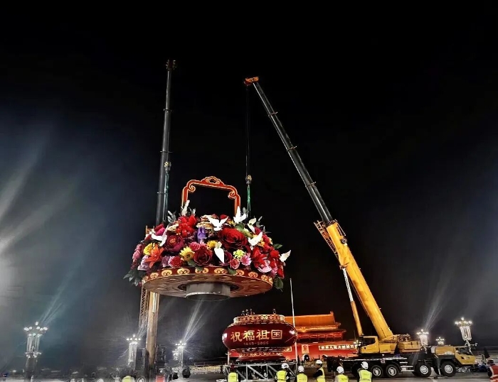 這已是徐工連續(xù)第十五年參與天安門國(guó)慶花籃吊裝任務(wù)。9月22日凌晨,兩臺(tái)徐工200噸級(jí)汽車起重機(jī)協(xié)同作業(yè),將重達(dá)60噸的籃盤平穩(wěn)起吊,與16米高的籃體實(shí)現(xiàn)毫米級(jí)精準(zhǔn)對(duì)接。