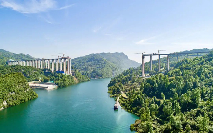 烏江特大橋全長(zhǎng)1834米,主橋?yàn)?04米上承式鋼管混凝土拱橋,是德余高速公路的重要控制性工程,也是世界最大跨徑上承式鋼管混凝土拱橋。大橋采用的拱、柱、梁全固結(jié)無(wú)支座整體式受力體系為國(guó)內(nèi)首創(chuàng),施工極具難度,代表了目前同類(lèi)型橋梁建造的世界頂級(jí)水平。