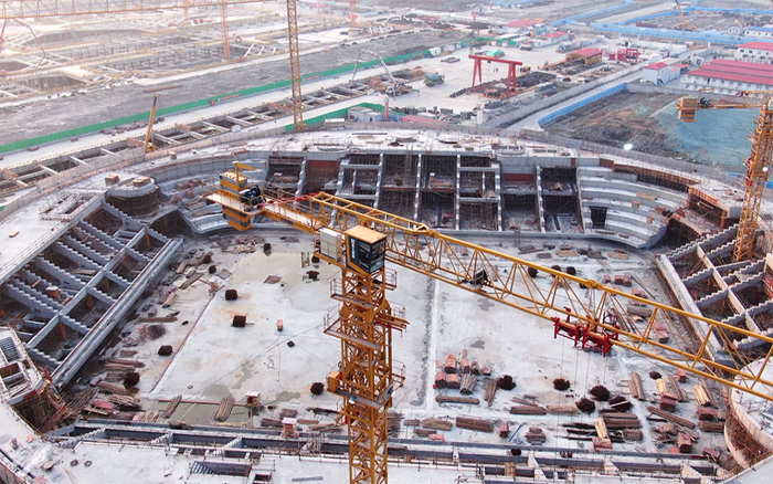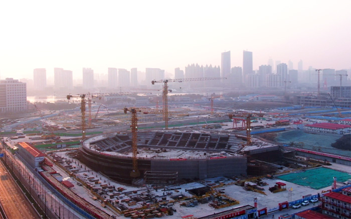 該項目造型獨特,主賽場區(qū)域結(jié)構(gòu)復(fù)雜,同時采用大量的曲線設(shè)計,給現(xiàn)場鋼筋、水泥預(yù)制件的制作與安裝帶來了巨大挑戰(zhàn),也對塔機的綜合性能提出極高要求。