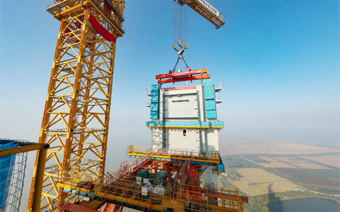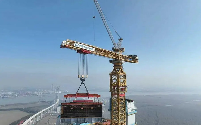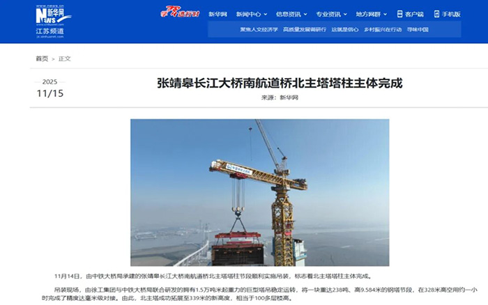在靖江市馬洲島上空,重達(dá)238噸的T29鋼塔節(jié)段在徐工XGT15000-600S超級(jí)塔機(jī)的穩(wěn)定牽引下平穩(wěn)攀升,精準(zhǔn)完成高空對(duì)接,整個(gè)吊裝過程中,塔身始終穩(wěn)如磐石,為張靖皋長江大橋關(guān)鍵節(jié)點(diǎn)的突破提供了堅(jiān)實(shí)支撐。
