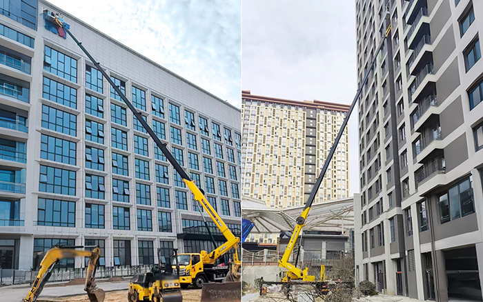 高層樓宇外側(cè)飄窗突出結(jié)構(gòu)密集分布,對高空作業(yè)的精準(zhǔn)度和靈活性要求極高。傳統(tǒng)設(shè)備因臂架笨重、跨障能力弱,難以精準(zhǔn)抵達(dá)作業(yè)點(diǎn)位,施工進(jìn)度頻頻受阻。而徐工 GKS45A 搭載“基本臂 + 六節(jié)伸縮臂 + 獨(dú)立飛臂” 創(chuàng)新結(jié)構(gòu),緊湊靈動的小飛臂如同精準(zhǔn)的 “高空畫筆”,輕松繞開各類障礙物,穩(wěn)穩(wěn)定格每一個作業(yè)位置,完美匹配新樓施工的嚴(yán)苛需求。